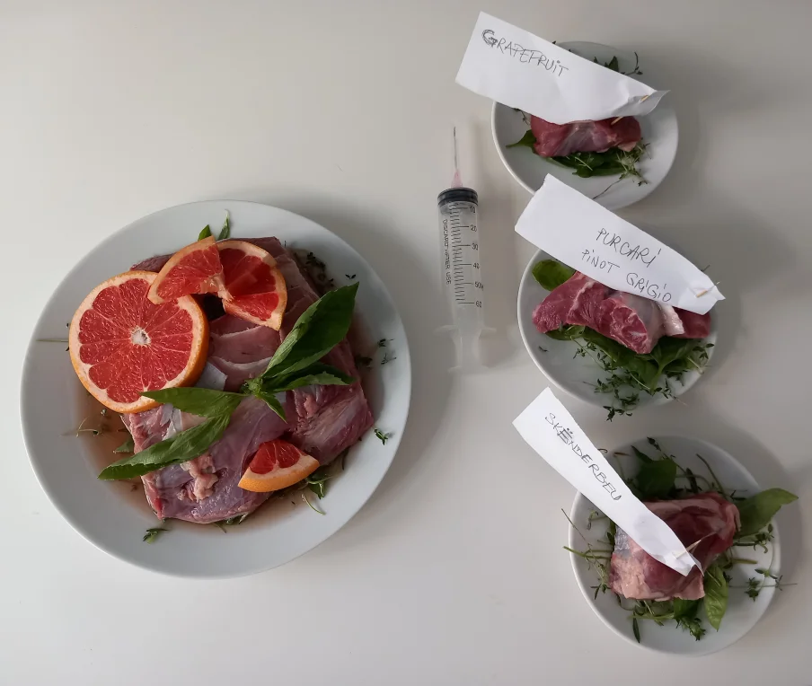 - cu o seringă de capacitate mai mare injectăm în fiecare mușchi sau textură a cărnii mixul de vin, brandy și suc de grapefruit.