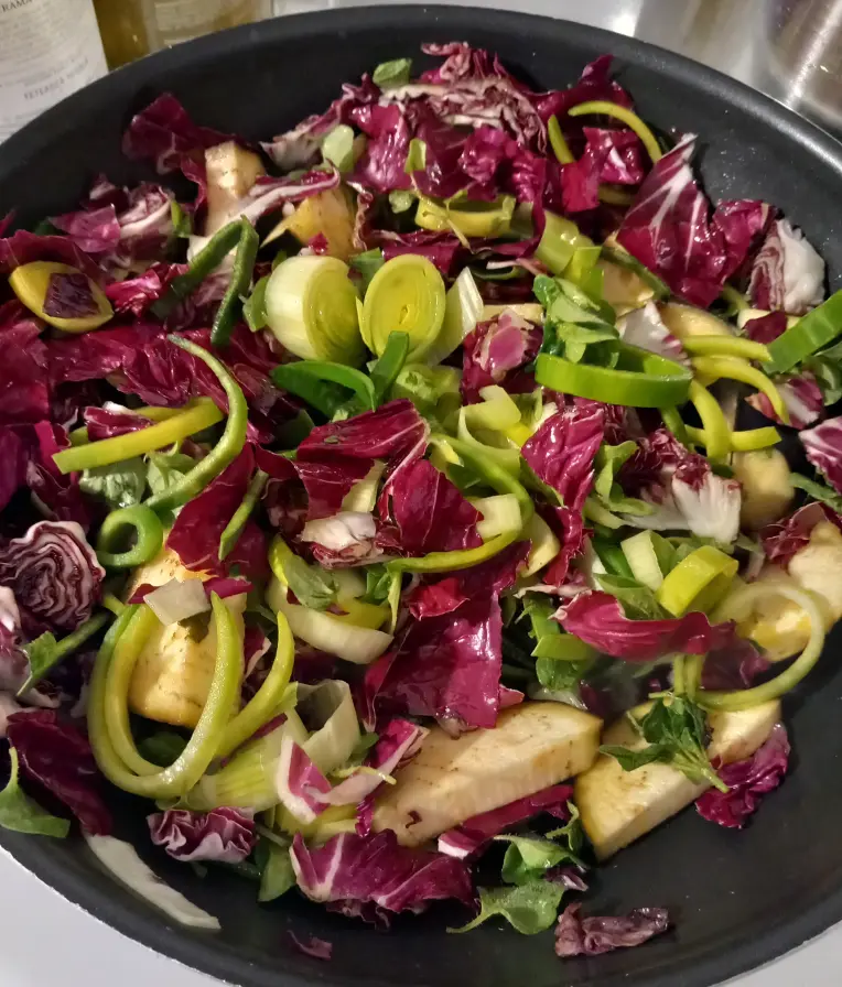 - adăugați apoi în tigaie și o jumătate de radicchio și o vânătă medie, tăiate tot mare, ca și prazul.